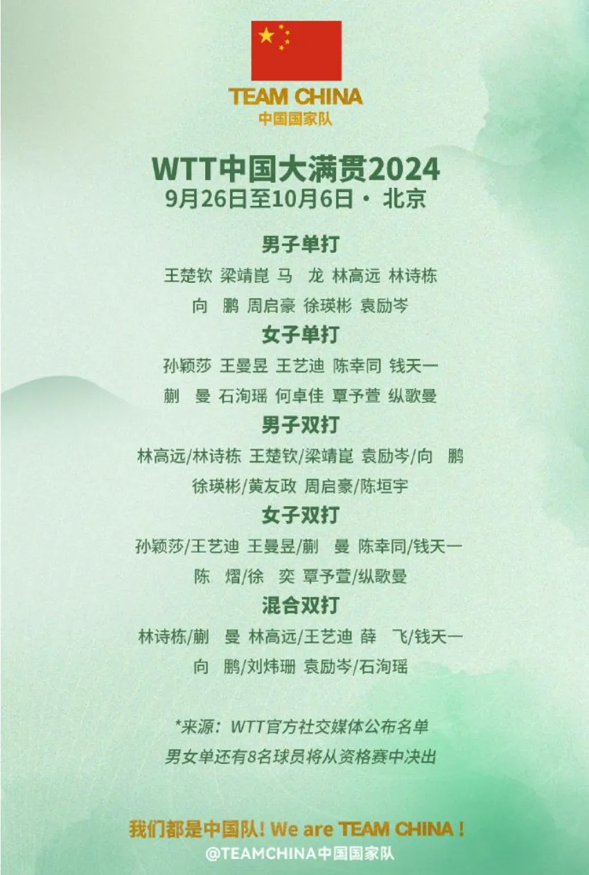 ▷WTT中国大满贯2024将于今天(9月26日)至10月6日在北京石景山首钢园举行,冠军将获得2000点世界排名积分。