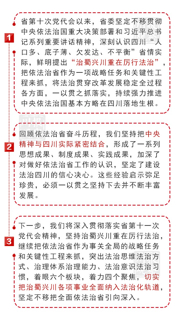 省第十次党代会以来,省委坚定不移贯彻中央依法治国重大决策部署和习近平总书记系列重要讲话精神,深刻认识四川“人口多、底子薄、欠发达、不平衡”省情实际,鲜明提出“治蜀兴川重在厉行法治”,把依法治省作为一项战略任务和关键性工程来抓,将法治贯穿改革发展稳定全过程各方面,一以贯之抓落实,持续强力推进中央依法治国基本方略在四川落地生根。