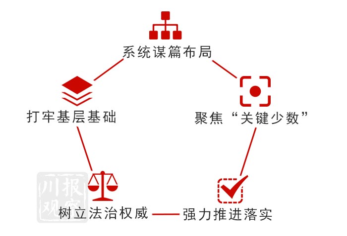 系统谋篇布局。省委落实习近平总书记发挥四梁八柱支撑作用的指示精神,把规划引领作为头等大事,出台《四川依法治省纲要》对法治四川建设做出总体规划,召开全会作出决定、对新时期法治建设进行全面部署,制定依法治省指标体系、评价标准、评估办法,成为检验法治落地落实情况的度量衡,构建了“1 + 4”四川法治体系。把法治放在“四个全面”战略布局中来把握,落实中央统一部署、统筹协调的要求,每次重大会议重要部署必强调依法治省,重点调研重要安排必包含依法治省,党政年度目标考核必突出依法治省。成立省委书记王东明任组长、专职副书记任常务副组长的依法治省领导小组,在办公厅设立省委副秘书长任专职主任的领导小组办公室;省“四套班子”办公厅和纪组宣统政五部门建立“4+ 5”推进机制;21个市(州)党委书记切实履行法治建设第一责任人职责,用落地生根的实际效果展示领导力和执行力;在全省上下构建了党委统筹揽总、部门各司其职、纵横联动推进工作格局。