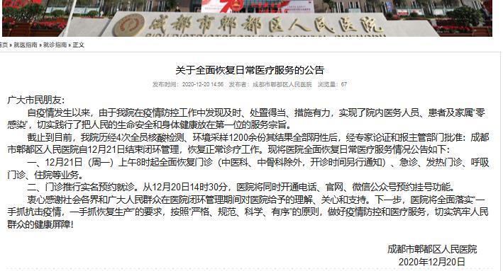 12月20日,成都市郫都区人民医院在网上发布公告。21日起将全面恢复日常医疗服务。