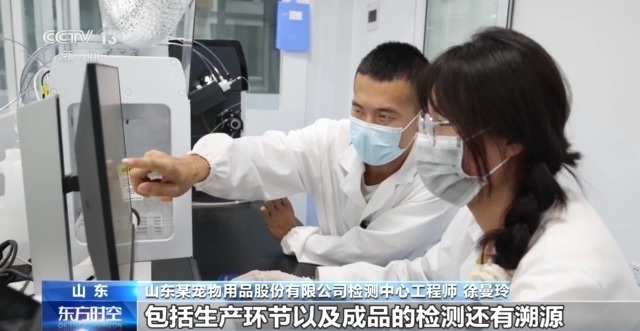 山东某宠物用品股份有限公司检测中心工程师 徐曼玲:检测中心实验室有100多台国内外顶尖设备,当原料进入内部之后,我们会对它进行验收才能入库,包括生产环节以及成品的检测还有溯源,我们都在把控。