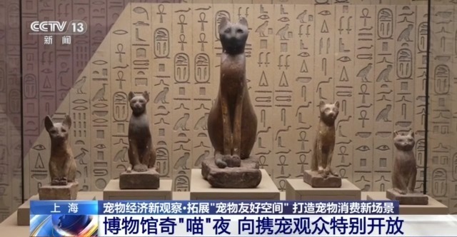 租一辆古埃及主题的猫推车、在古猫神庙前与爱宠留影、与爱宠一起探索古埃及文物……周六的晚上,上海博物馆《古埃及文明大展》夜场向携宠观众特别开放,展厅内,不仅有多件与猫相关的文物,耳边回荡着的神秘猫叫声,专属的猫咪文创礼品,为观众奉上一场了沉浸式观展之旅。