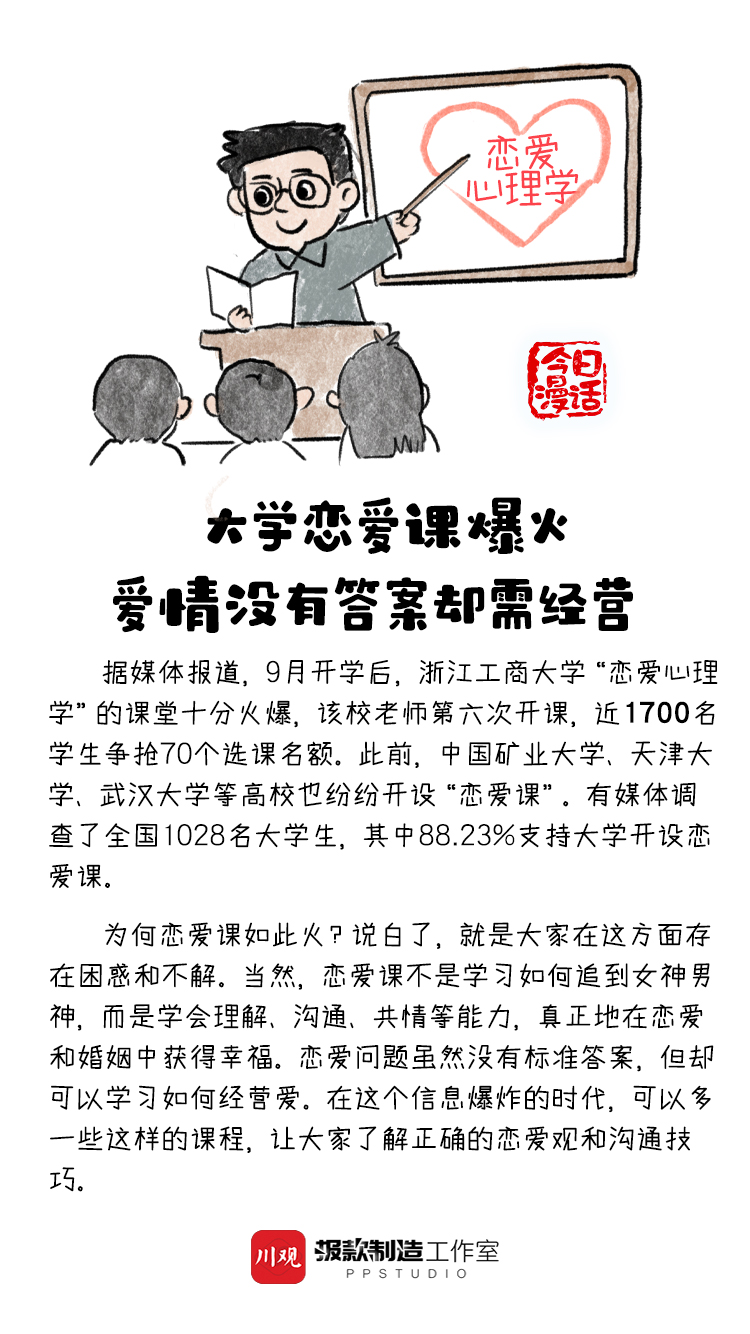 据媒体报道,9月开学后,浙江工商大学“恋爱心理学”的课堂十分火爆,该校老师第六次开课,近1700名学生争抢70个选课名额。此前,中国矿业大学、天津大学、武汉大学等高校也纷纷开设“恋爱课”。对此,你怎么看?