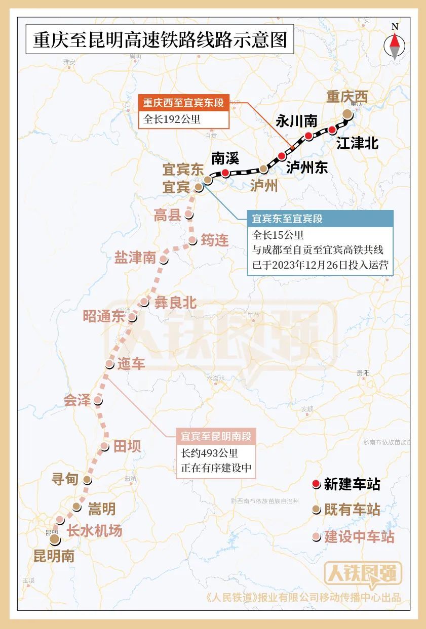 全线分段建设,此次开通的重庆西至宜宾东段全长192公里,设重庆西、江津北、永川南、泸州东、泸州、南溪、宜宾东等7个车站,其中江津北、永川南、泸州东、南溪为新建车站,其余为既有车站;宜宾东至宜宾段全长15公里,与成都至自贡至宜宾高铁共线,已于2023年12月26日投入运营;宜宾至昆明南段长约493公里,正在有序建设中。