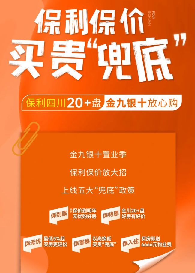 保利四川公司的“兜底”政策,则属于9月12日联动全川20余个楼盘推出的金九银十置业季的相关活动,“保价到明年”只是五大“兜底”政策中的一项,其余政策是“保特惠”“保无忧”“保置换”“保入住”,主要是为了减少购房者的后顾之忧,保障客户权益,并以更为优惠的政策吸引购房者,如“买房即送6666元物业费”“首付最低5%超长分期”等,缓解购房者的置业压力。