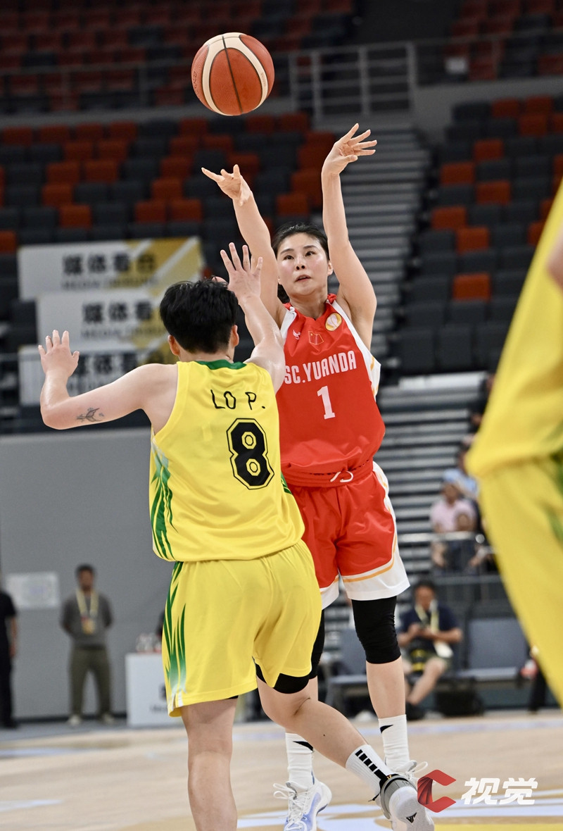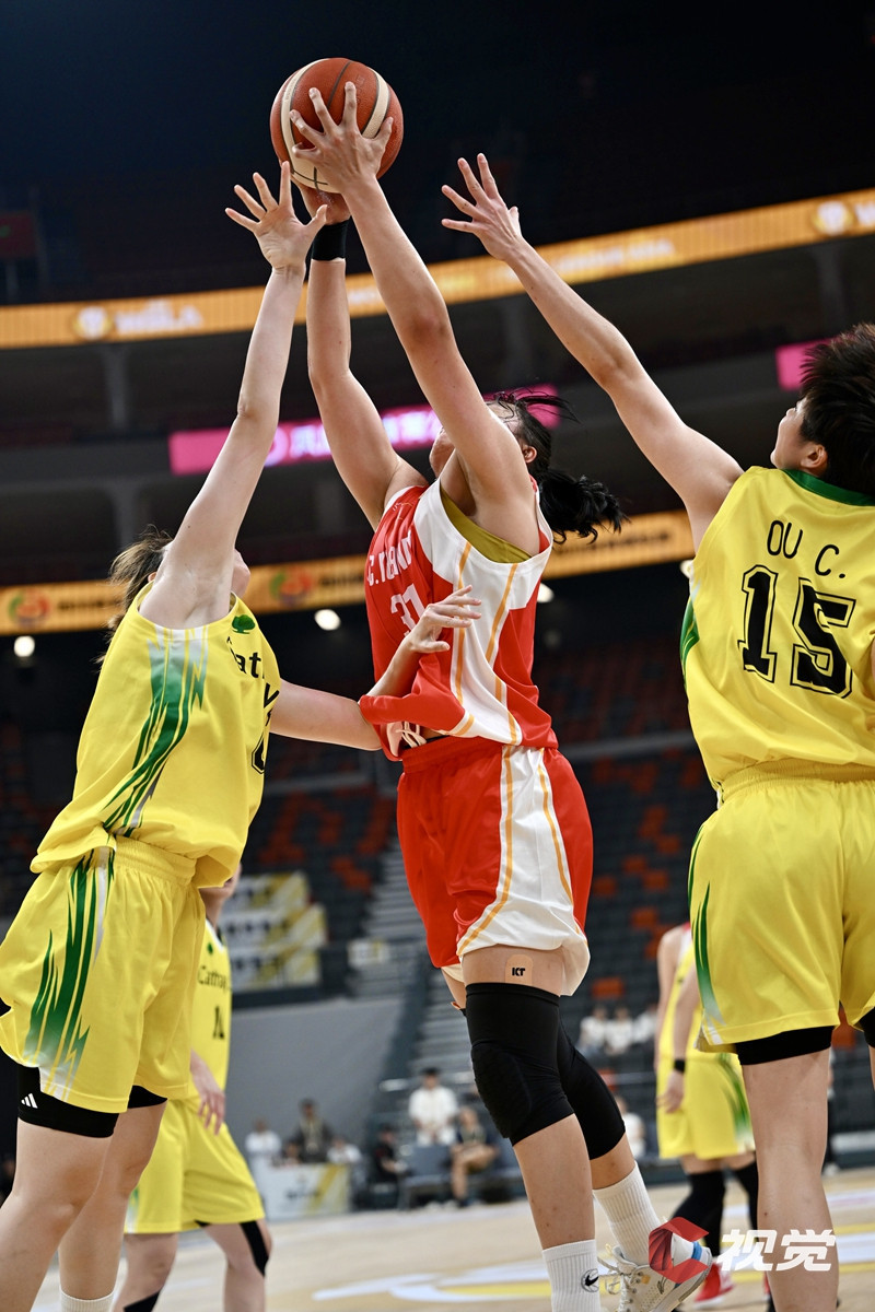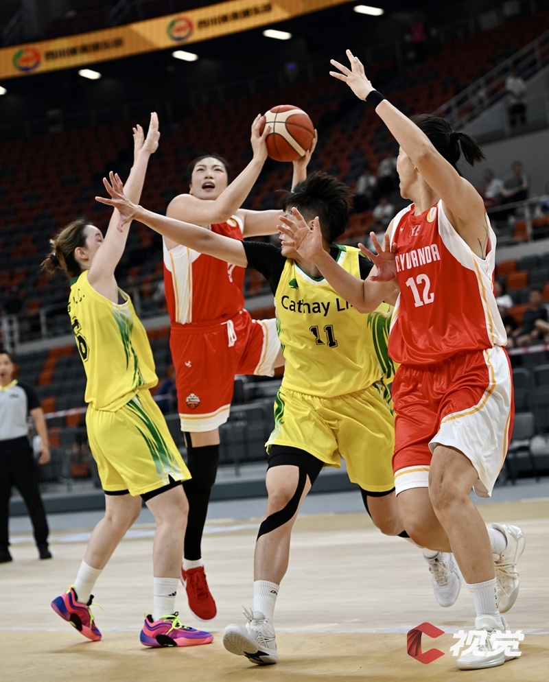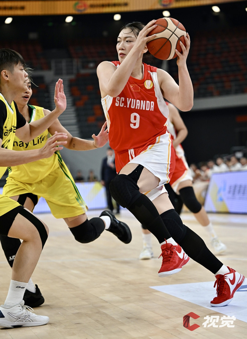 四川远达美乐女篮(红色球衣)与中国台北国泰人寿女篮(黄色球衣)比赛中