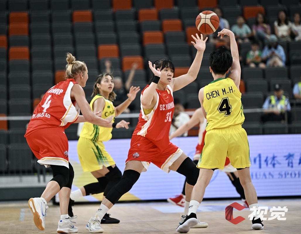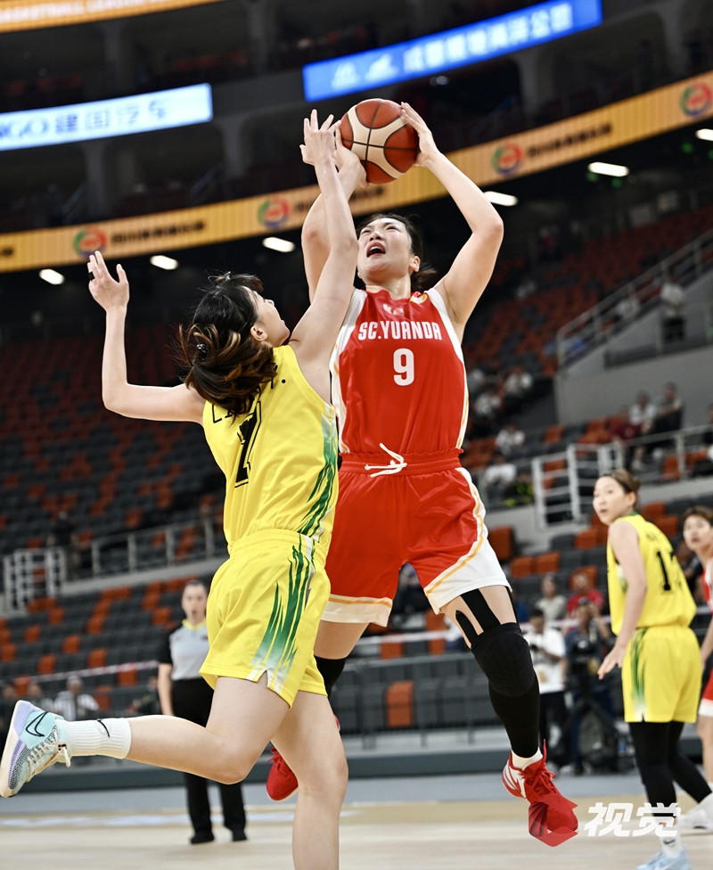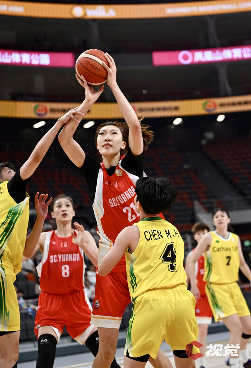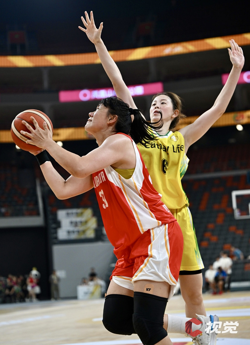 四川远达美乐女篮(红色球衣)与中国台北国泰人寿女篮(黄色球衣)比赛中