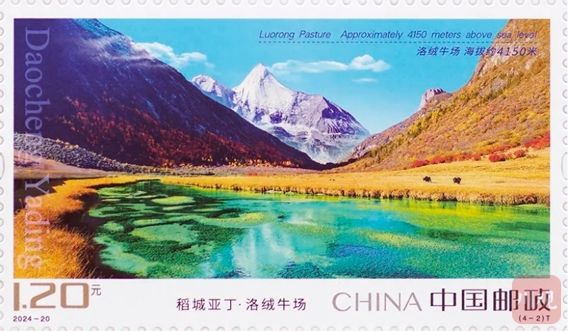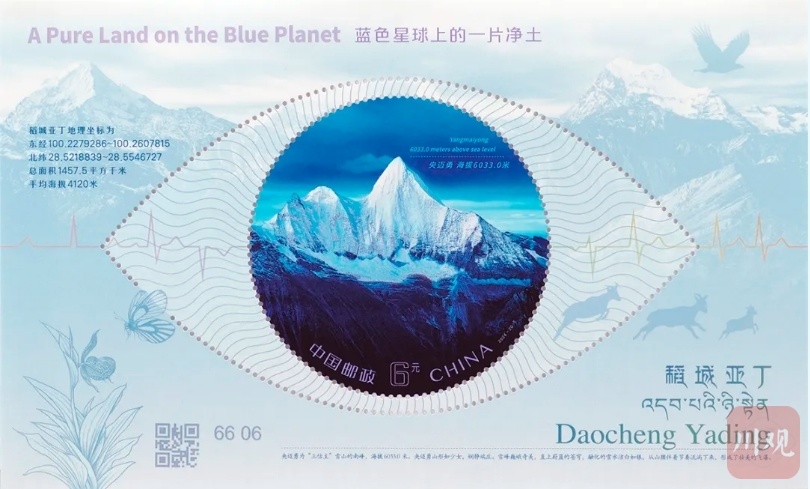 仪式上,一套精美的《稻城亚丁》特种邮票及小型张展现在众人面前,分别展现了夏诺多吉、洛绒牛场、五色海、仙乃日四大标志性景观,而小型张则聚焦于央迈勇雪山,将稻城亚丁的壮丽与神秘展现得淋漓尽致。