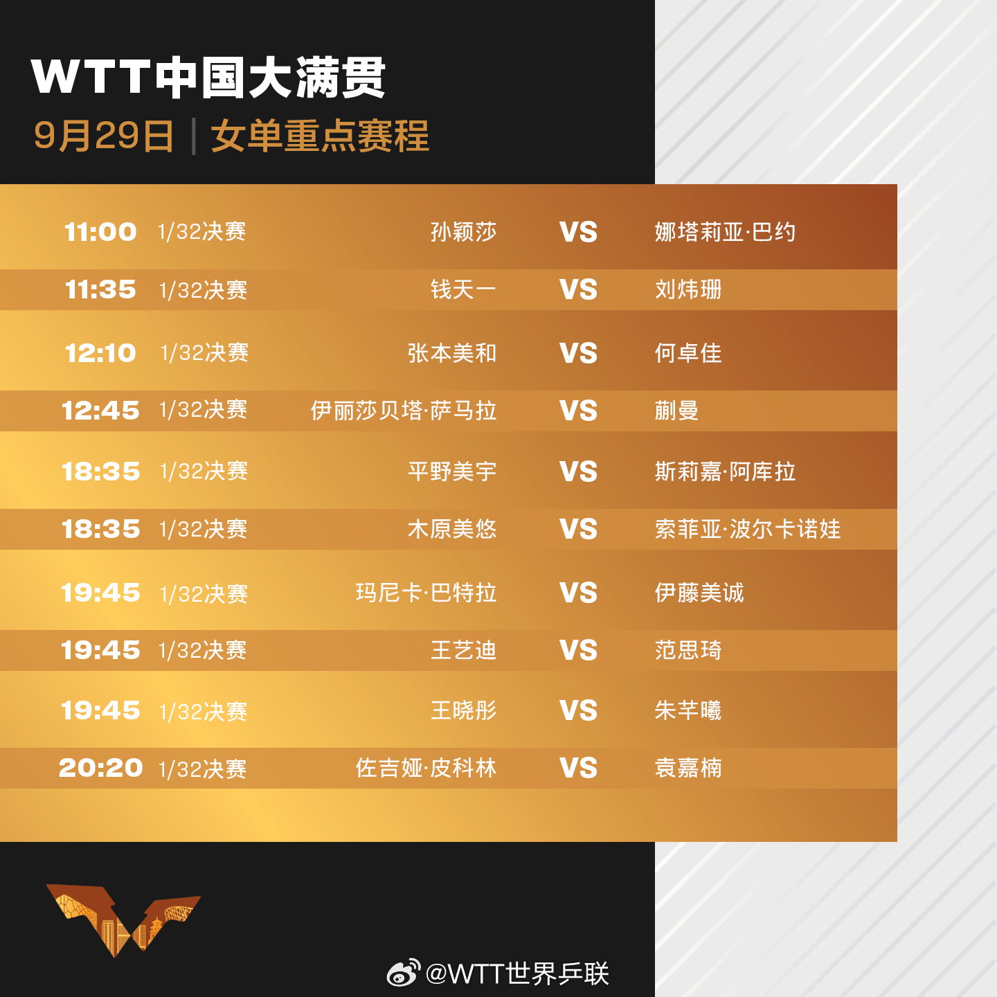 WTT中国大满贯赛今天(29日)正式打响,女单头号种子孙颖莎 、二号种子王曼昱分别镇守上、下半区,孙颖莎将在首轮对阵波兰选手娜塔莉亚·巴约,王曼昱和另一位中国选手石洵瑶将在首轮相遇。孙颖莎所在的半区还包括中国选手王艺迪,以及来自日本的伊藤美诚和平野美宇。