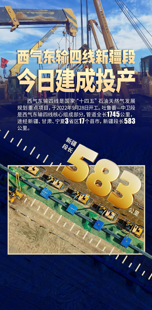 西气东输四线管径1219毫米,设计年输气量150亿立方米,经增压后可达300亿立方米。西气东输四线(吐鲁番—中卫)段全线投产后,将与一线、二线、三线互联互通,推动西气东输管道系统年输送能力达千亿立方米,将有利于缓解现阶段天然气管输瓶颈,拓展未来煤制气外输通道,对推动新疆经济社会高质量发展、保障国家能源安全具有重要意义。