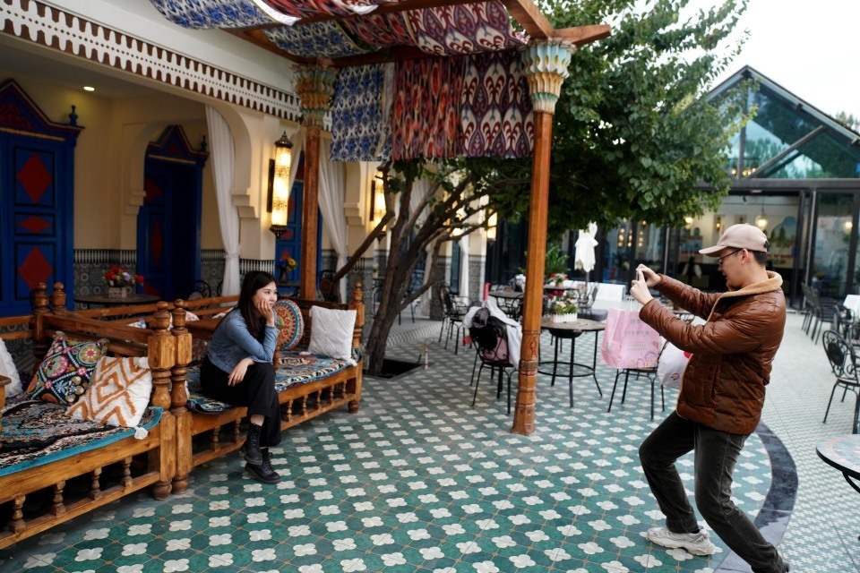 9月27日,游客在六星街的一家特色小店拍照。新华社记者 赵宇思 摄