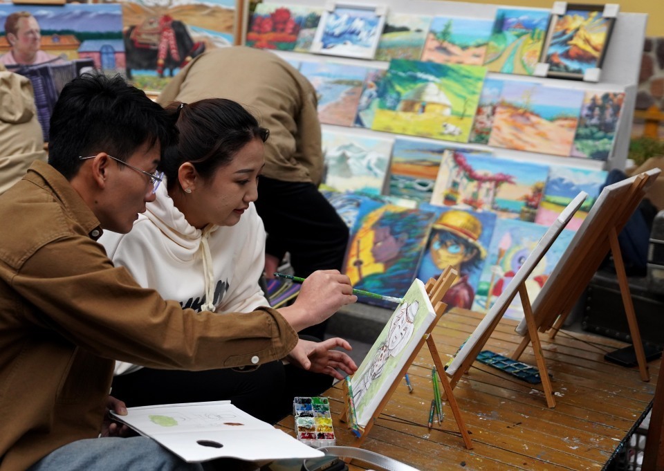 9月27日,两名游客在六星街体验画油画。新华社记者 赵宇思 摄