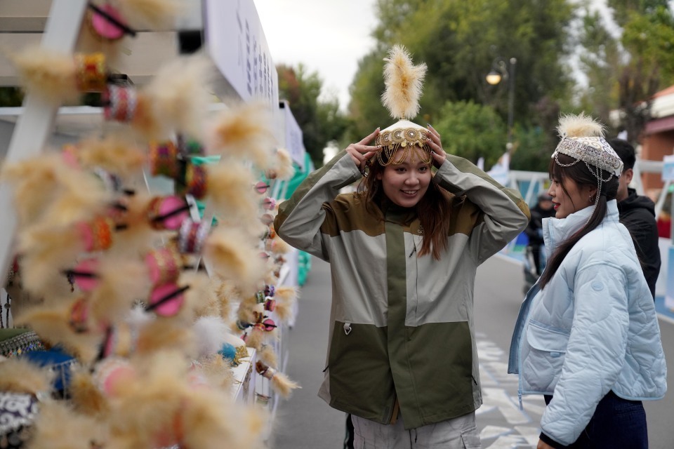 9月27日,两名游客在六星街挑选帽子。新华社记者 赵宇思 摄