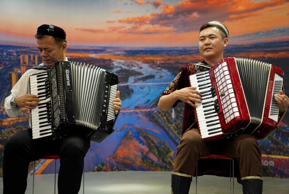 9月27日,在伊宁六星街,两位手风琴表演者在亚历山大手风琴珍藏馆为游客演出。新华社记者 赵宇思 摄