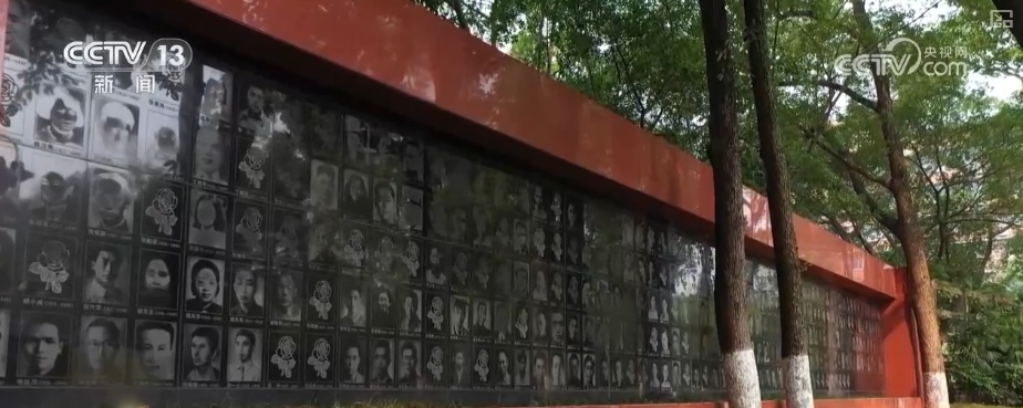 位于重庆市沙坪坝区的歌乐山烈士陵园,巨大的国旗、党旗鲜艳夺目。“浩气长存”大型烈士群雕耸立其间,雕像高11米,由438块红色花岗石堆砌而成,上面9名烈士的形象,代表着解放前夕牺牲在白公馆渣滓洞集中营的300多名红岩英烈。陵园内,有一面纪念墙,上面展示了牺牲烈士的照片和名字。