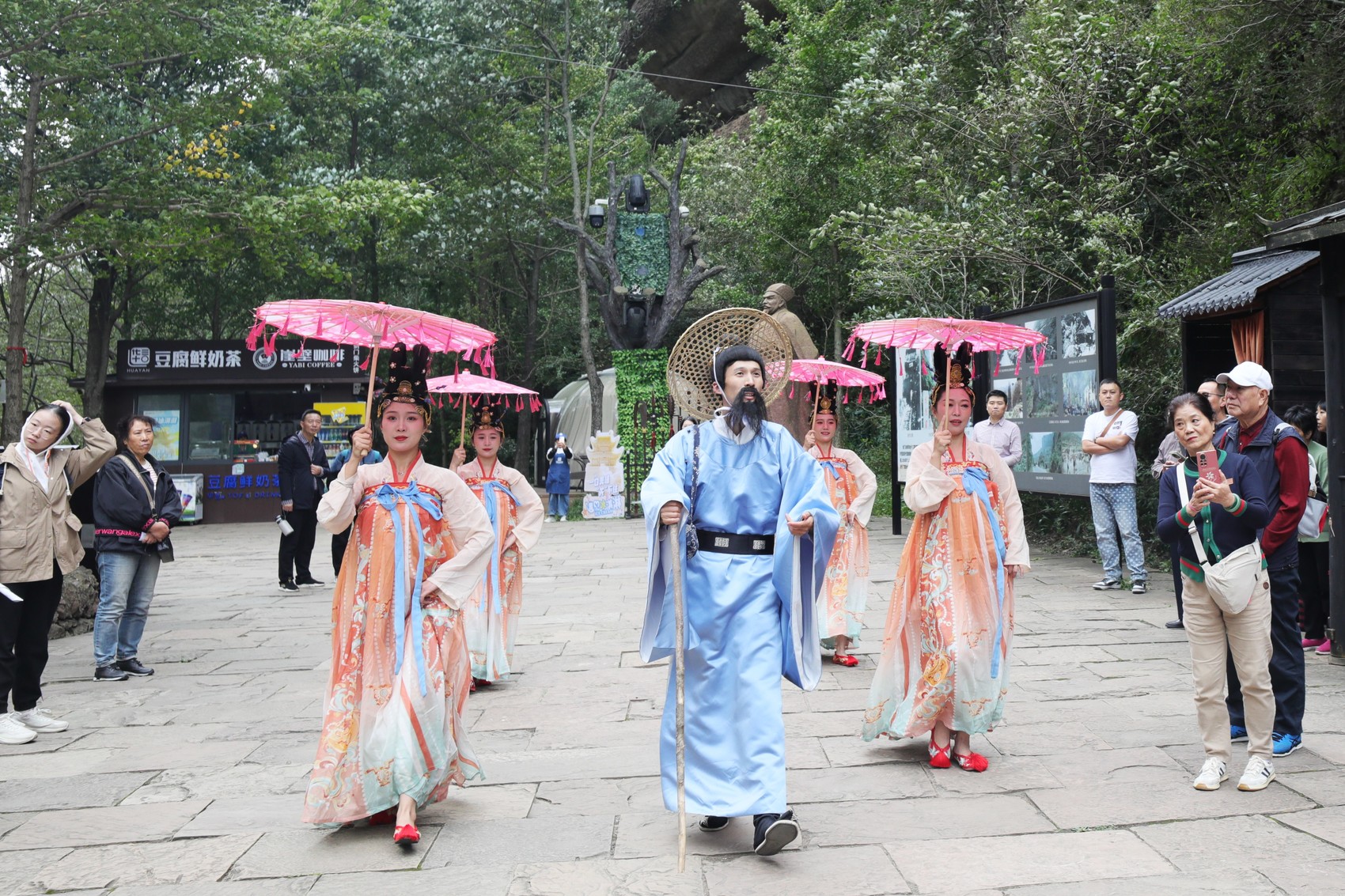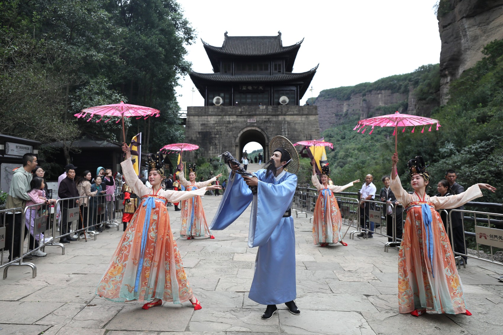 10月1日上午,剑门关主题情景剧表演,吸引游人纷纷驻足观看。