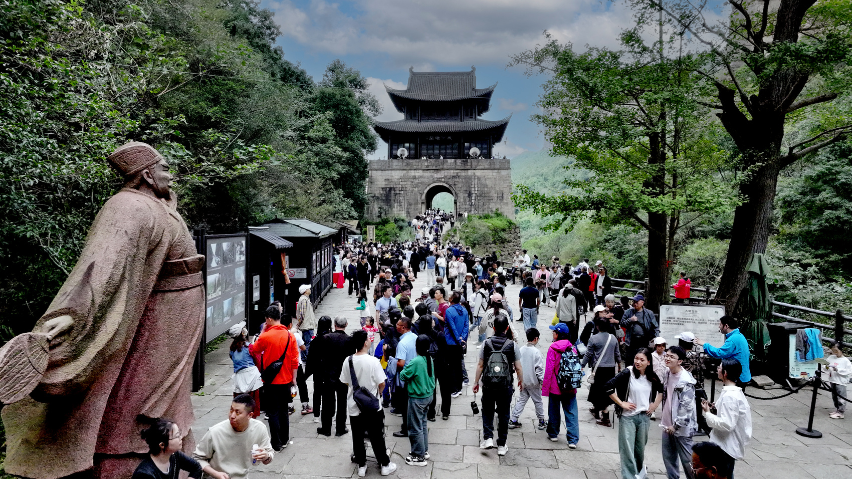 10 月 2 日,剑门关景区迎来客流小高峰,当日接待游客超 5.33 万人次。图为:剑门关景区人流如织。