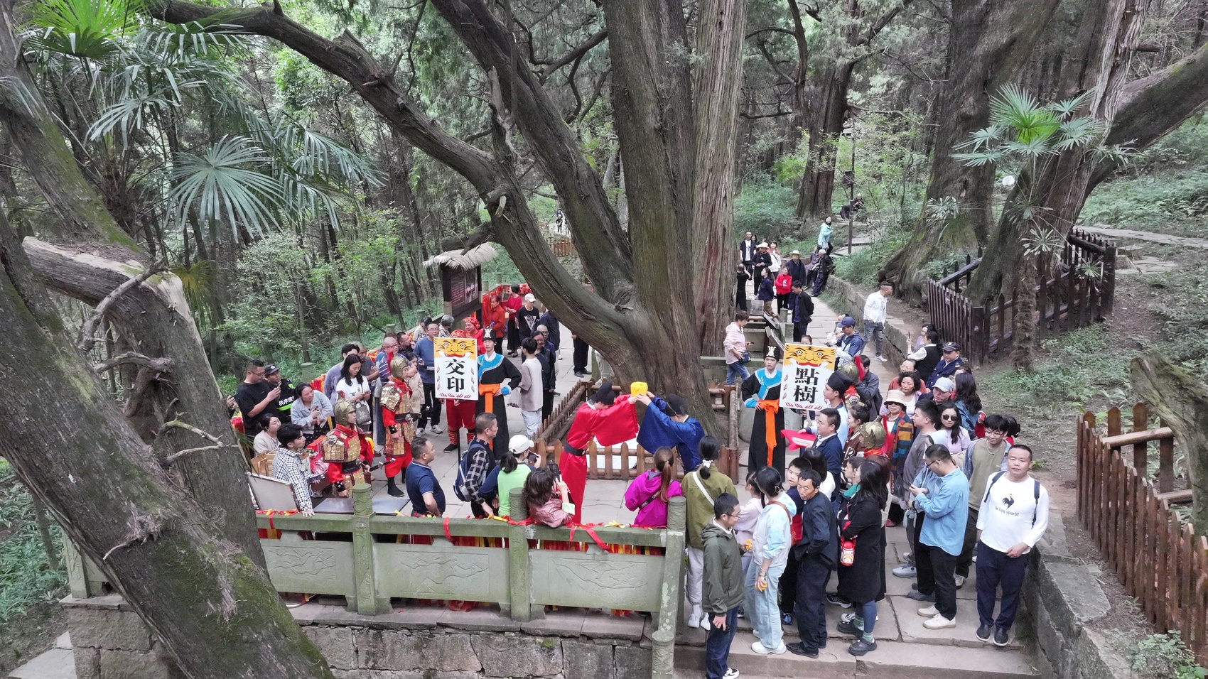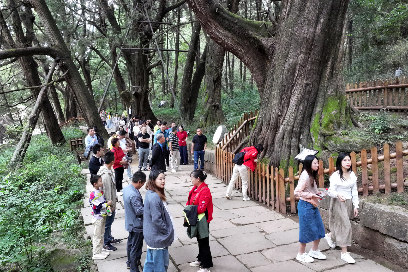 10 月 2 日,剑门关景区迎来客流小高峰,当日接待游客超 5.33 万人次。图为:翠云廊景区“点树交印”古制巡演。