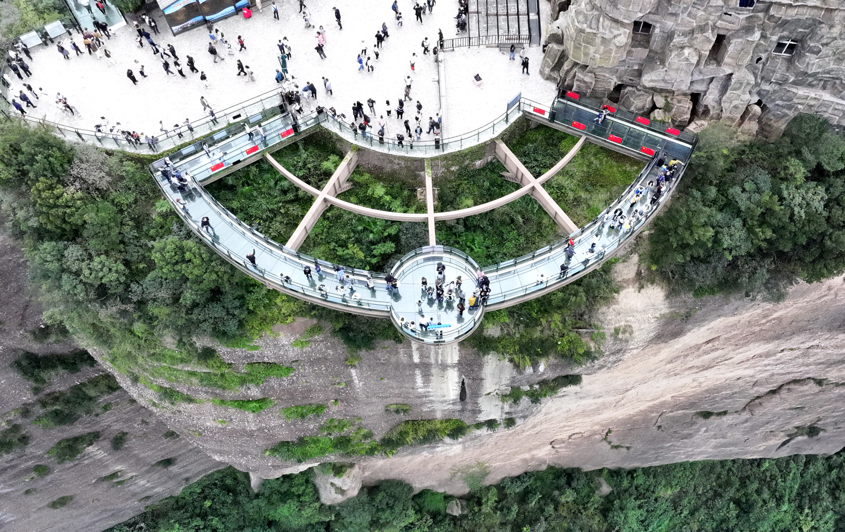 10 月 2 日,剑门关景区迎来客流小高峰,当日接待游客超 5.33 万人次。图为:游人在玻璃观景平台游览。
