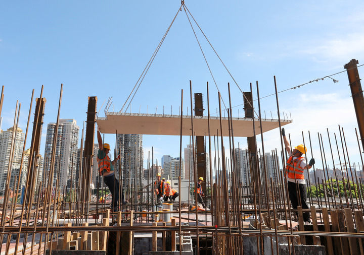 10月3日,中建五局的建设者在深圳湾超级总部基地C塔项目建设现场施工。新华社记者 梁旭 摄