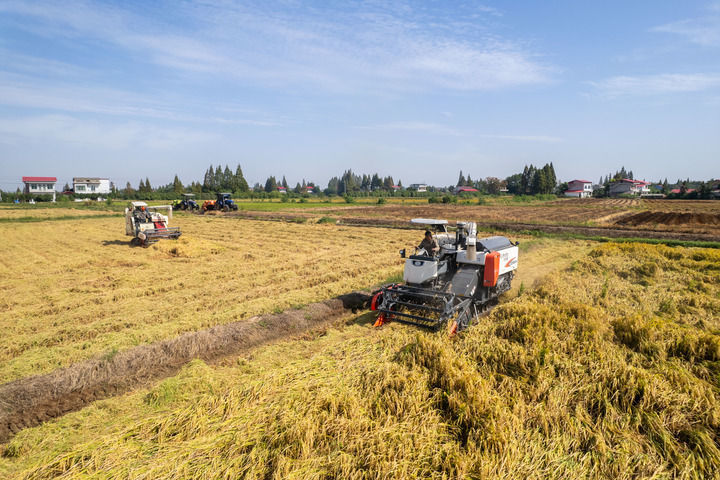 10月2日,湖南省益阳市南县麻河口镇蔡家铺村村民开展水稻机械收割作业(无人机照片)。新华社记者 陈思汗 摄