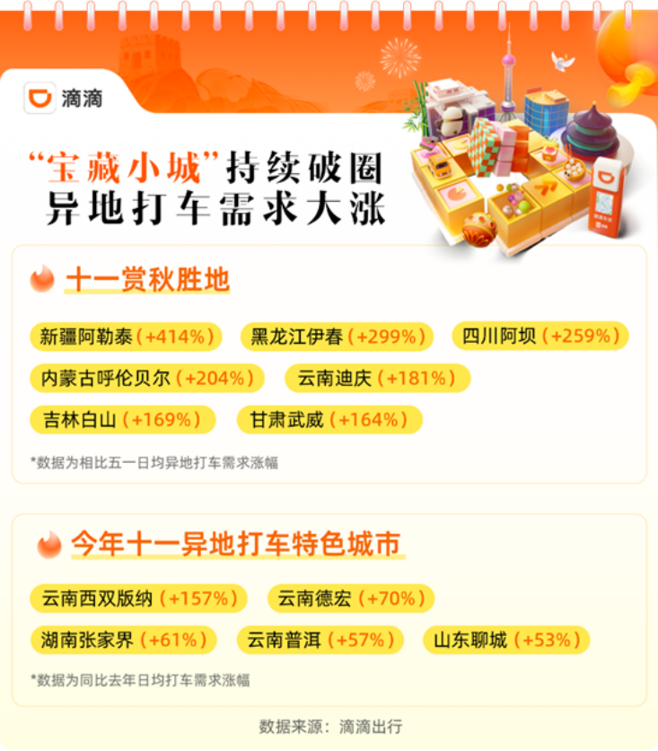 滴滴顺风车出行数据显示,今年国庆假期滴滴顺风车订单量相比节前上涨202%,成都是使用滴滴顺风车最多的城市。滴滴出行的打车订单中,大城市在多种出行方式中持续领跑,古城、古镇类旅游景点的打车需求相比节前上涨111%。各式“宝藏小城”持续破圈,三四线城市的异地打车需求相比节前提升130%。与“五一”假期相比,国庆假期新疆阿勒泰、黑龙江伊春、四川阿坝等地日均异地打车需求涨幅均超过160%。