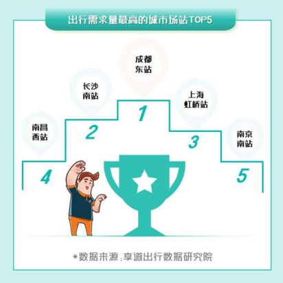 上汽集团移动出行战略品牌——享道出行的网约车需求同比去年国庆增长53.59%;全国异地出行需求量同比增长52.68%,需求高峰集中在10月2日至4日。场站接驳出行,一直是用户选择网约车出行的主要场景,国庆假期全国各地以机场、高铁站、火车站为起点或目的地的场站出行需求旺盛,其中各地高铁站尤其火爆。9月30日至10月7日,成都东站位列享道出行国庆热门场站第一。