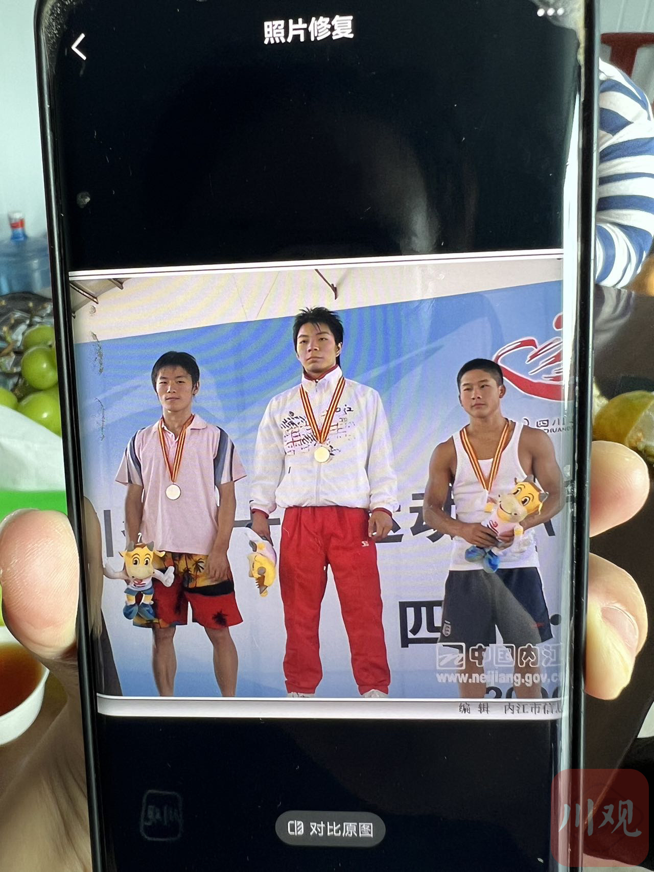 刘钦强(中)展示曾经的比赛获奖照片 受访者供图