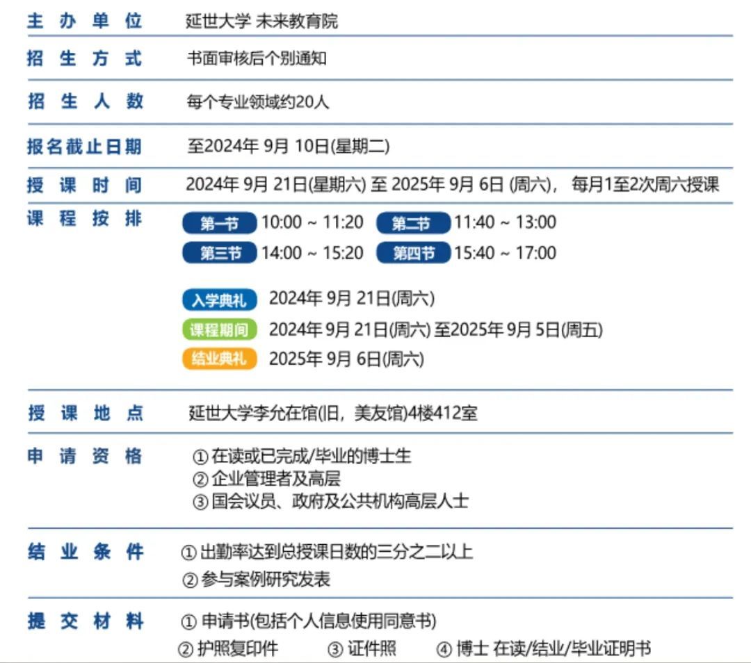 上述项目资料宣称,在读或已毕业的博士生;企业管理者及高层;国会议员、政府及公共机构高层人士具备申请资格,每月1至2次周六授课。