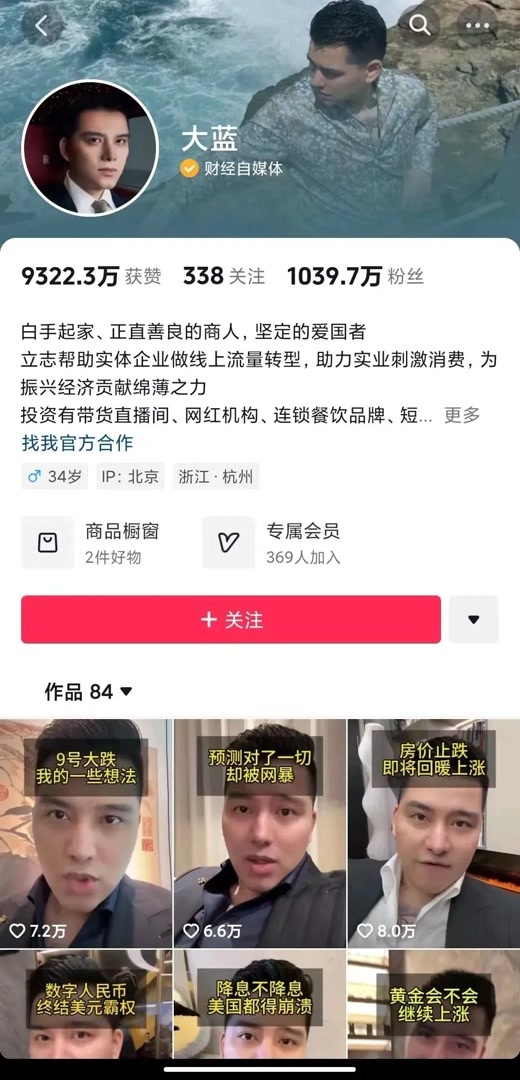 此外,平台近期已处置多个典型案例。其中包括,账号“大蓝”在今年9月底至10月初期间,多次发布特定股票涨跌预测内容,如“新手炒股赚钱买哪只股票”“30号跟着我买的今天高开已经赚死”“开盘直接进某股票吧,我绝不可能诱导你们进来我出货”等,煽动网民全仓买入某特定股票。该行为严重触犯法律法规,抖音平台决定对其无限期封禁该账号。