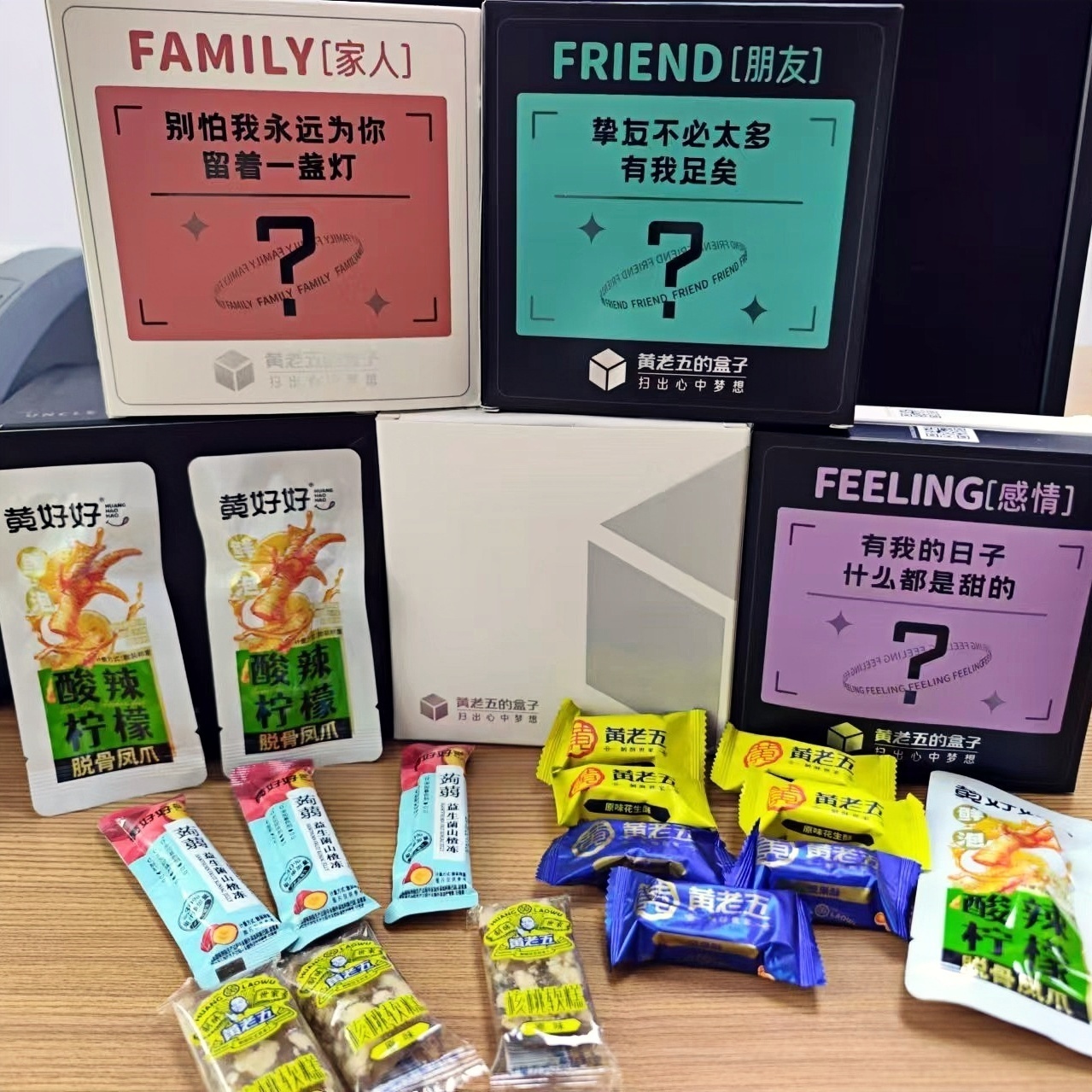 礼包一·黄老五盒子:内含五种黄老五热销零食,每种都爆好吃。