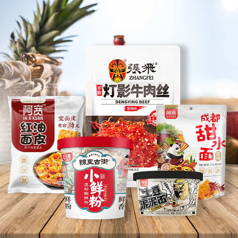 礼包二·阿宽风味礼盒:土豆泥面、红油面皮、酸辣粉、成都甜水面;“中华老字号”张飞牛肉。