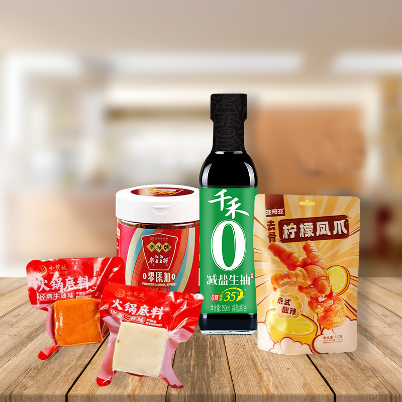 礼包三·四川特色调味料礼包:小龙坎牛油火锅底料、千禾减盐生抽、鹃城牌郫县豆瓣;亚玛亚去骨柠檬凤爪。