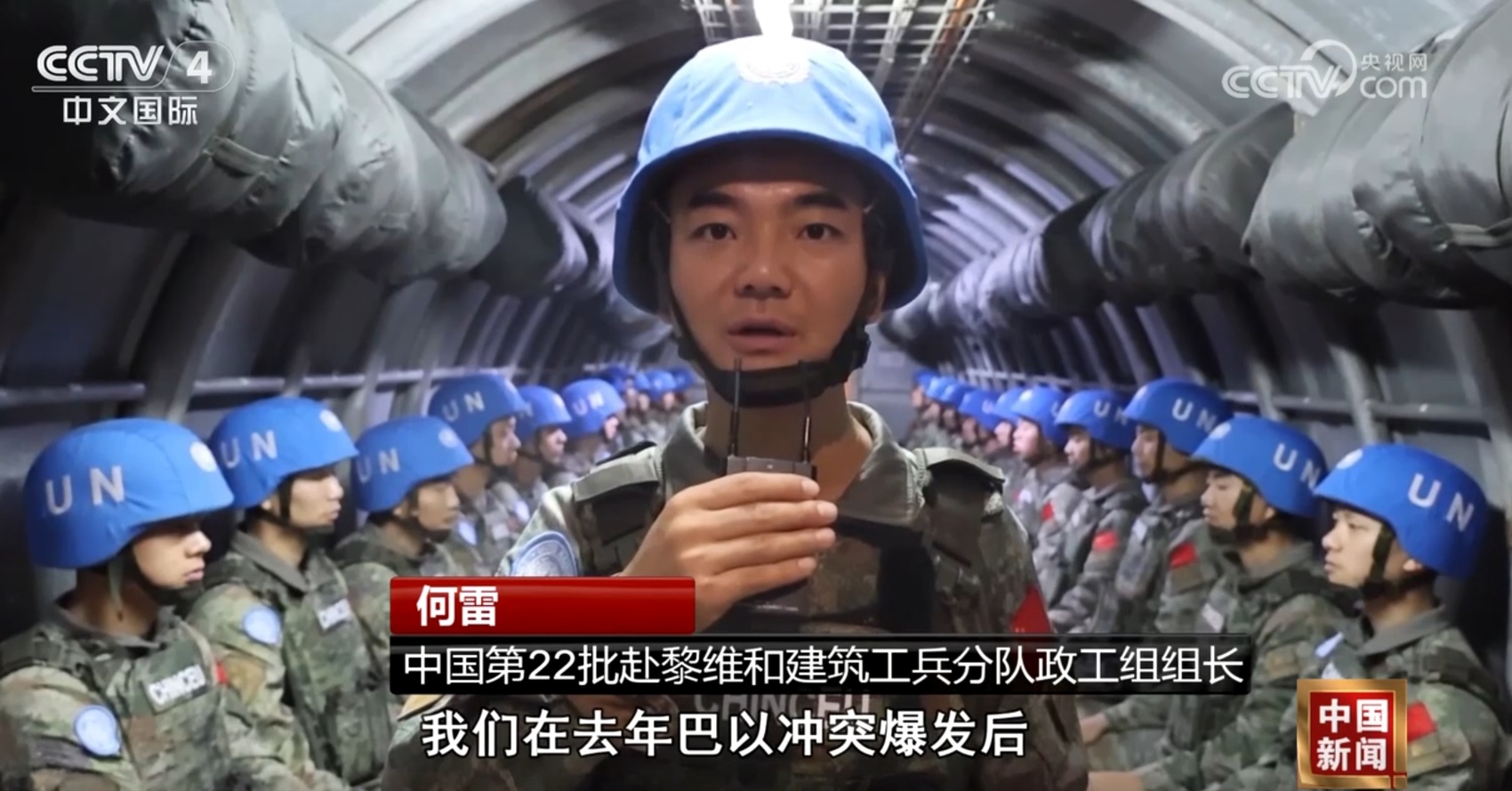 中国第22批赴黎维和建筑工兵分队政工组组长何雷称:“我现在所处的位置是距离‘蓝线’仅6公里的中国维和营区地下防空掩体。我们在去年巴以冲突爆发后,顶着极大安全风险进行轮换,执行‘蓝线’工程施工、人道主义援助等维和任务。对于我们赴黎维和建筑工兵分队来说,从来到这里的第一天起,警报声、枪声、炸弹声等等都不绝于耳,火箭弹、无人机往来不断,战机时常在头顶释放音爆进行威慑。距离我们营区最近的爆炸点不足1公里,弹片砸落在营区,我们每名维和官兵无论是在执行任务还是在营区,都要求全程穿戴防护装具,随时应对可能发生的交火、恐怖袭击等险情。每次遇到险情拉响防空警报后,无论在干什么,所有人员必须立即执行预案,快速进入掩体,等待下一步命令。此外,着眼于长期依托地下掩体开展工作和生活的实际,我们在防空掩体内增设了战备食品、医疗器材、通信设备、日常用品等6类1000余件防护保障物资,持续优化改进掩体的生活条件,在掩体出口增设铁网,预防无人机攻击。截至目前,我们已经在掩体连续度过了10余天,所有人员全部在岗,状态良好。”