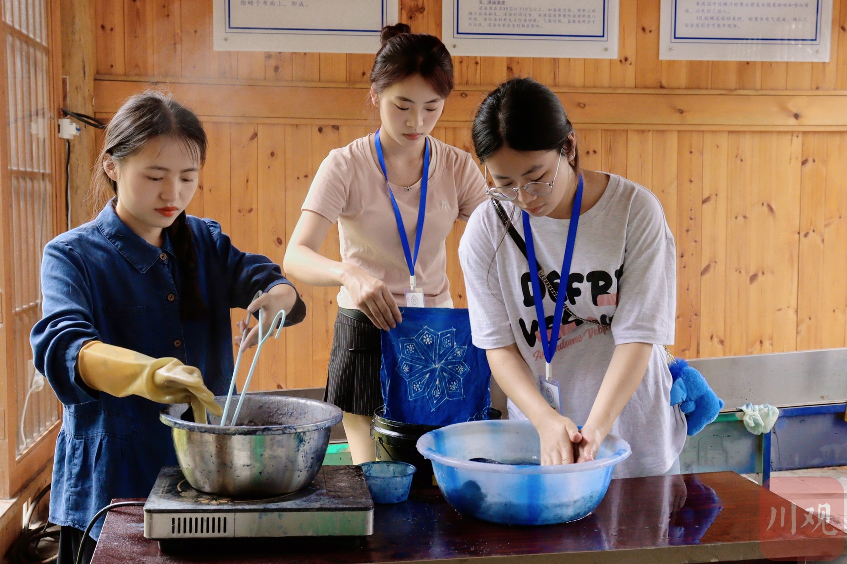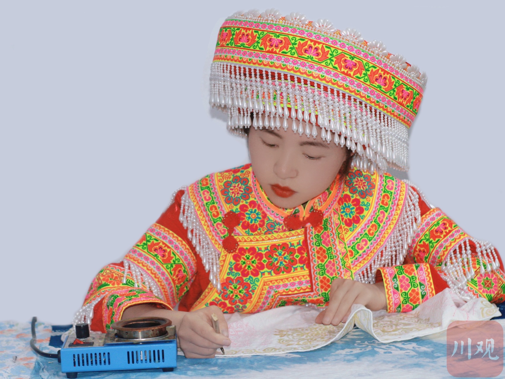 今年27岁的刘宇,成长于珙县罗渡苗族乡王武寨村,童年被传统苗族百褶裙的绚丽色彩所环绕。在王武寨村,无论是日常生活,还是婚丧嫁娶等重要场合,苗族百褶裙等民族服饰都是当地女性穿着中不可或缺的一部分。从小,刘宇就目睹了村里的老人制作百褶裙蜡染的一幕幕场景,深受苗族蜡染文化的熏陶。