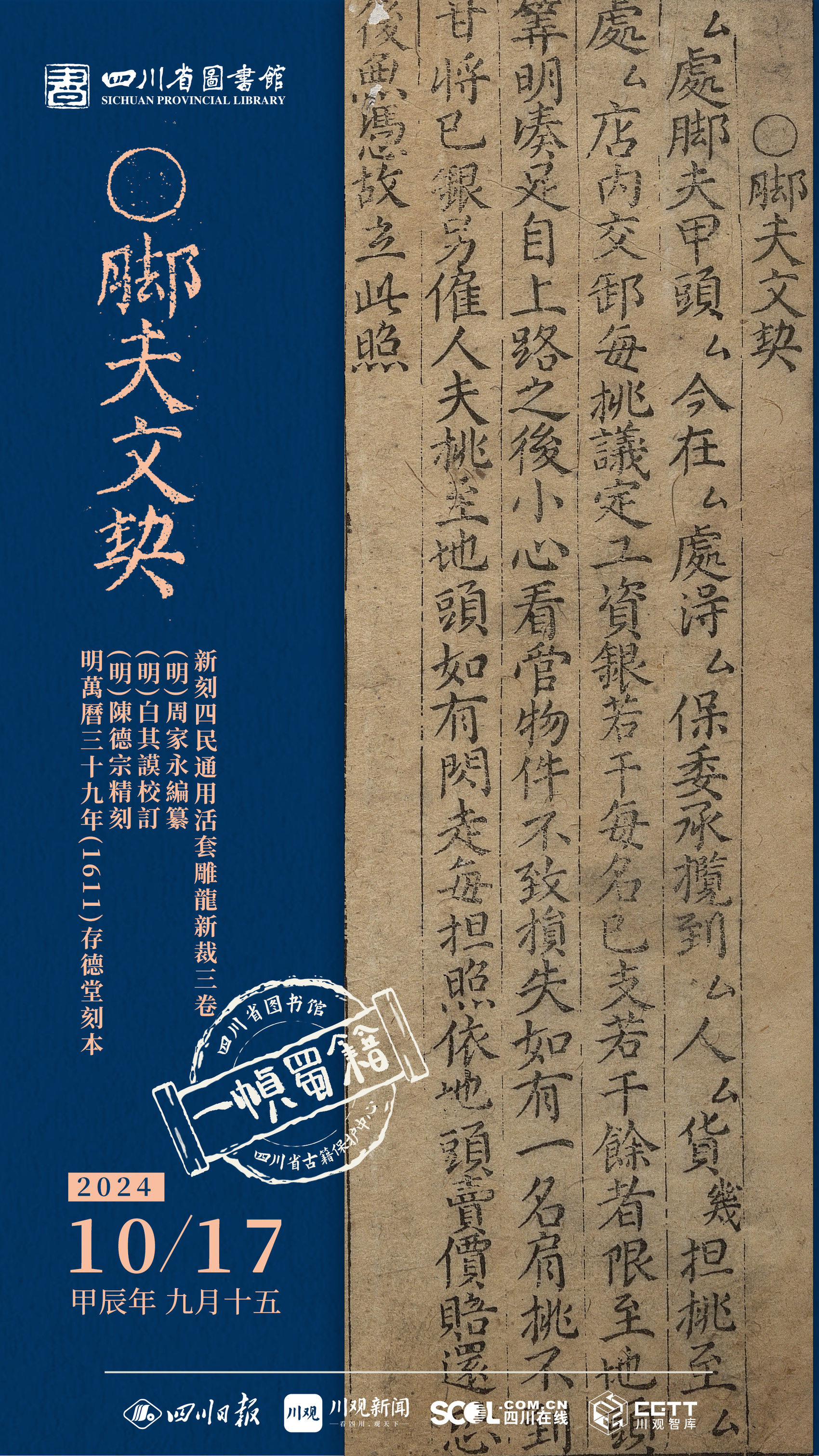 10月17日,一帧蜀籍向你介绍明代民间契约。海报所选用图为新刻四民通用活套雕龙新裁三卷,(明)周家永编纂,(明)白其护校订,(明)陈德宗精刻,明万历三十九年(1611年)存德堂刻本。
