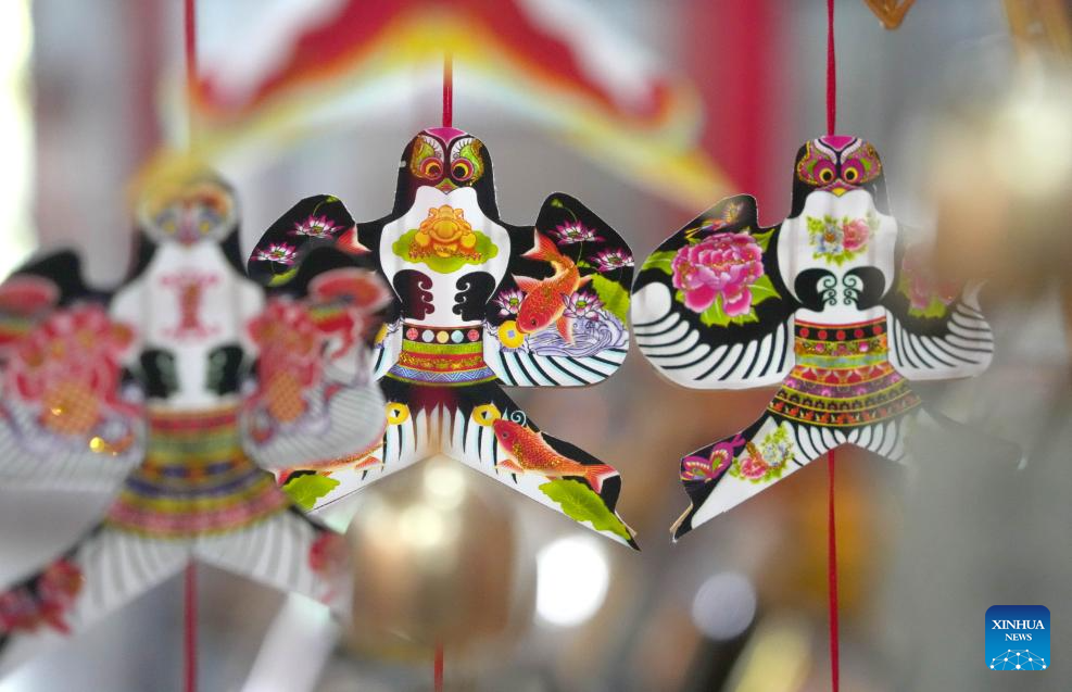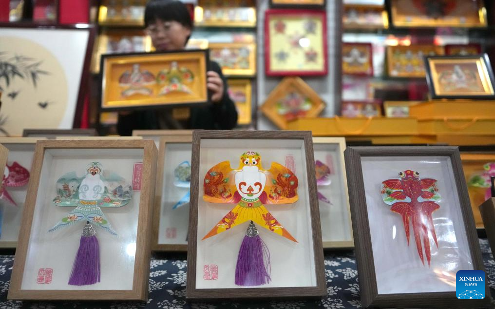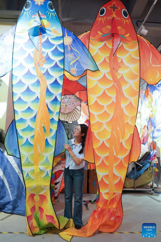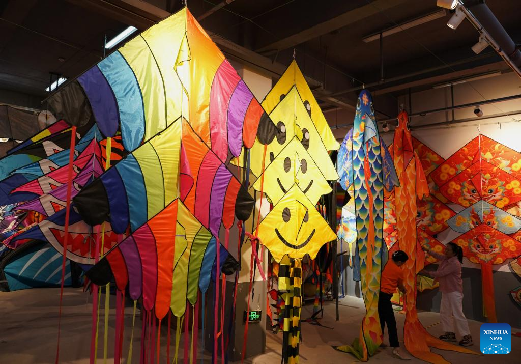 Creative cultural products themed on kites are pictured at a kite workshop in Hanting District of Weifang, east China's Shandong Province, Oct. 14, 2024. The kite culture and thriving kite industry in Weifang have a long and rich history. In 2006, the manufacturing skill of Weifang kites was listed as a national intangible cultural heritage.
