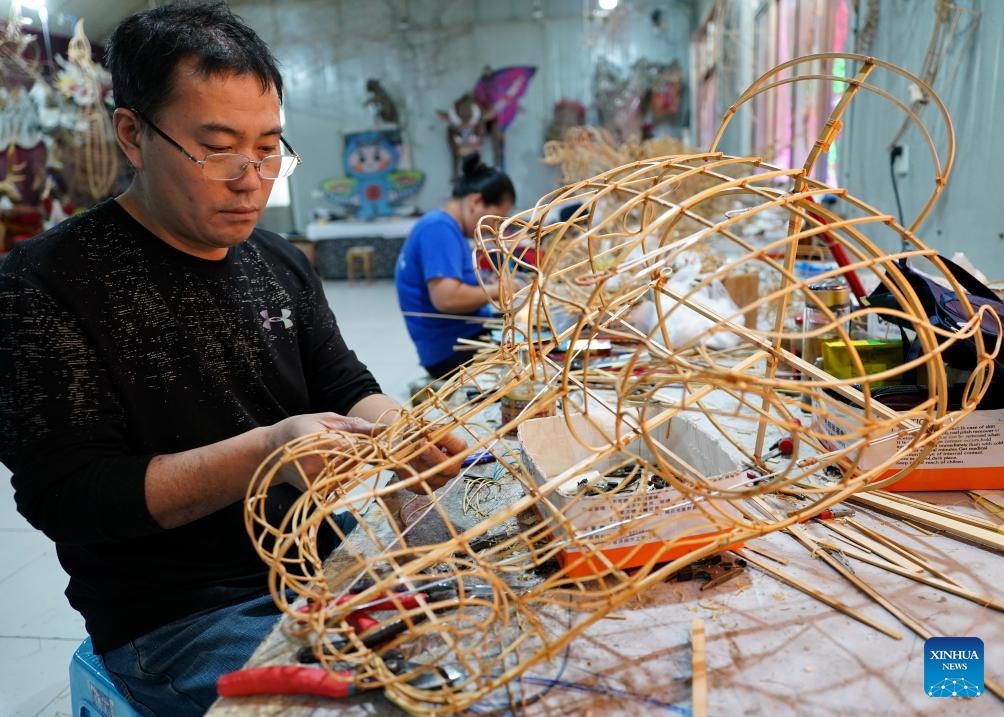 A worker makes the skeleton of kites at a kite workshop in Hanting District of Weifang, east China's Shandong Province, Oct. 14, 2024. The kite culture and thriving kite industry in Weifang have a long and rich history. In 2006, the manufacturing skill of Weifang kites was listed as a national intangible cultural heritage.