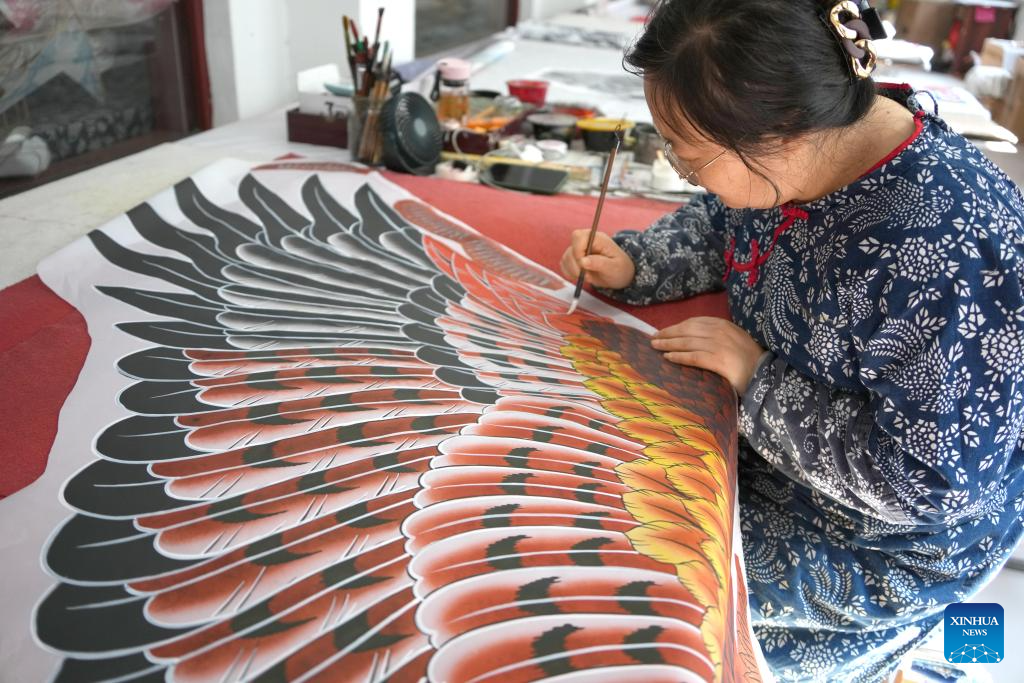 A worker paints the pattern of a kite at a kite workshop in Hanting District of Weifang, east China's Shandong Province, Oct. 14, 2024. The kite culture and thriving kite industry in Weifang have a long and rich history. In 2006, the manufacturing skill of Weifang kites was listed as a national intangible cultural heritage.