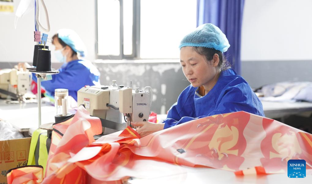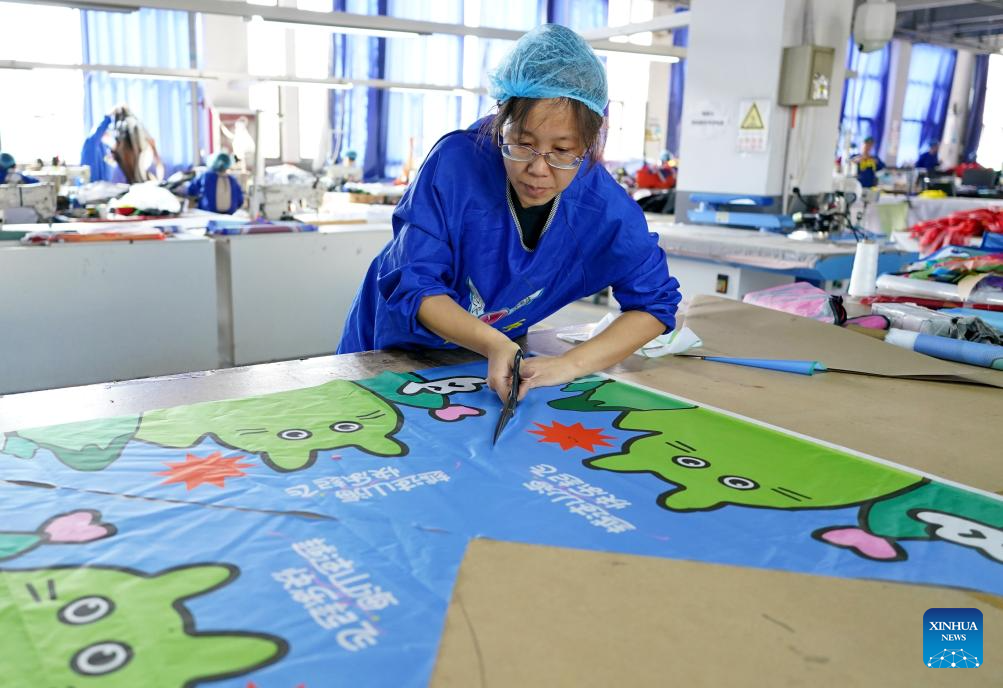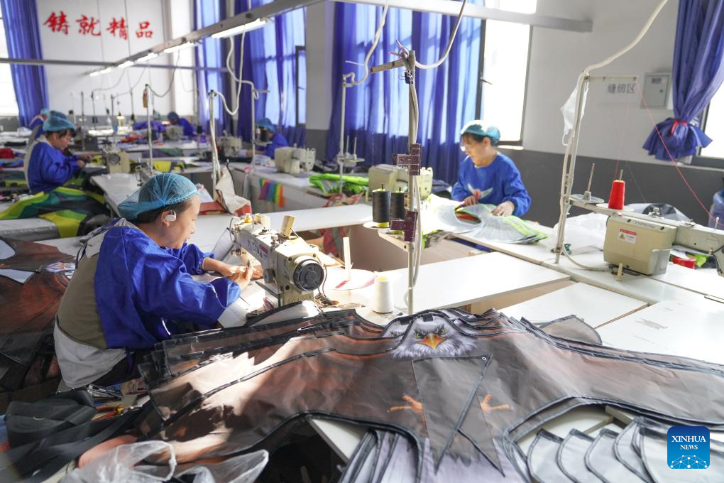 Workers make kites at a kite factory in Hanting District of Weifang, east China's Shandong Province, Oct. 14, 2024. The kite culture and thriving kite industry in Weifang have a long and rich history. In 2006, the manufacturing skill of Weifang kites was listed as a national intangible cultural heritage.