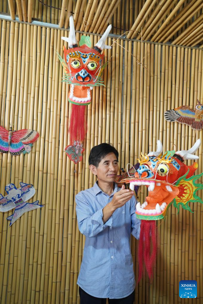 Guo Hongli, a kite-making inheritor, showcases a traditional dragon-shaped kite in Hanting District of Weifang, east China's Shandong Province, Oct. 14, 2024. The kite culture and thriving kite industry in Weifang have a long and rich history. In 2006, the manufacturing skill of Weifang kites was listed as a national intangible cultural heritage.
