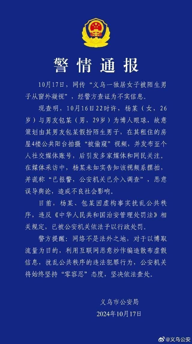 10月17日,义乌市公安局发布警情通报:网传“义乌一独居女子被陌生男子从窗外凝视”,经警方查证为不实信息。