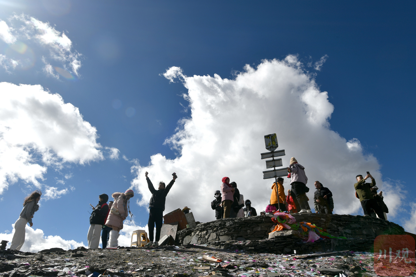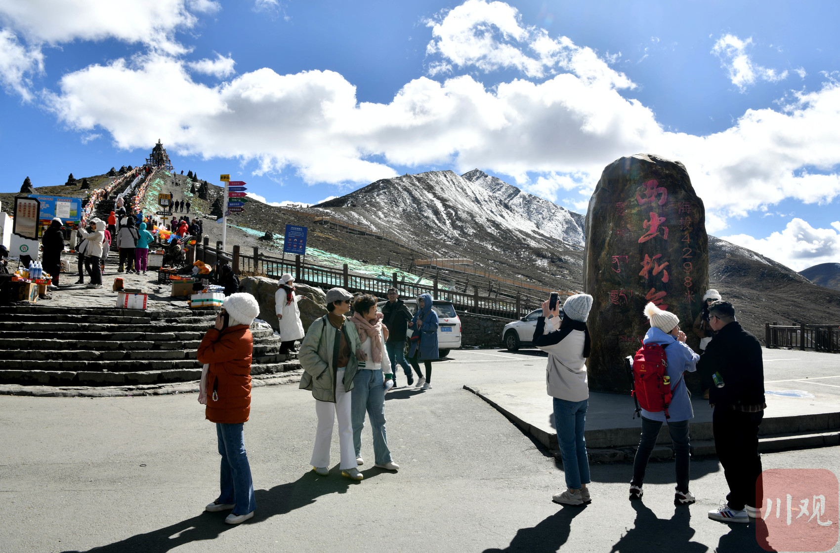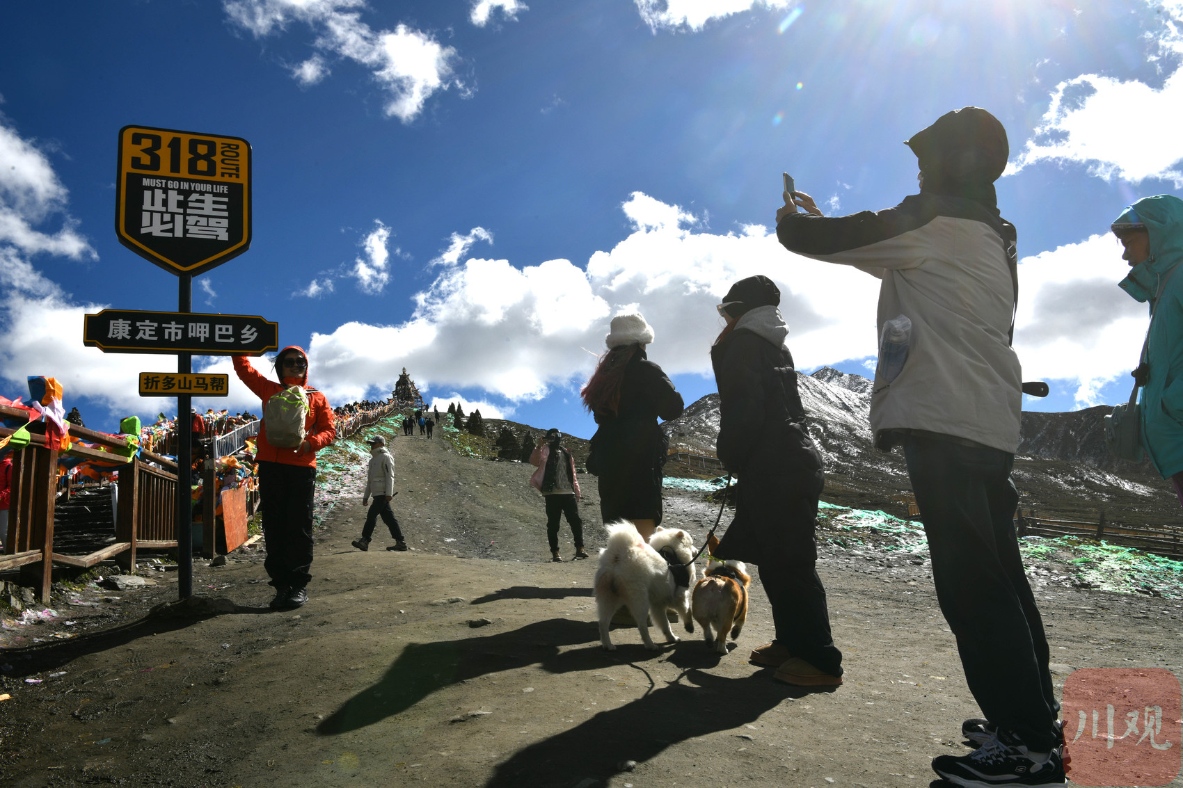 10月17日,川观新闻记者在折多山垭口看到,操着各地口音的旅行者沿着上山步道观景打卡,初入高原看到的壮美景色打消了他们旅途的疲惫。