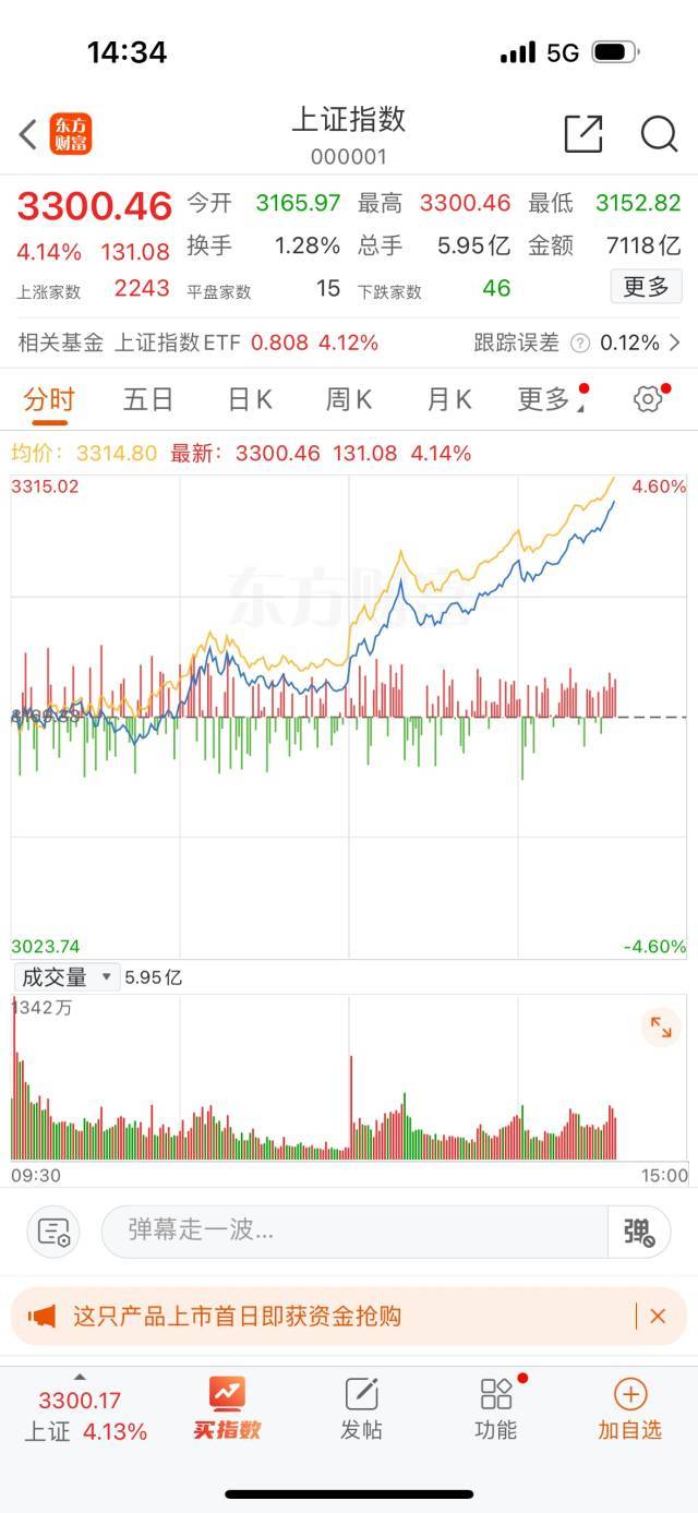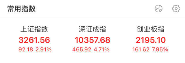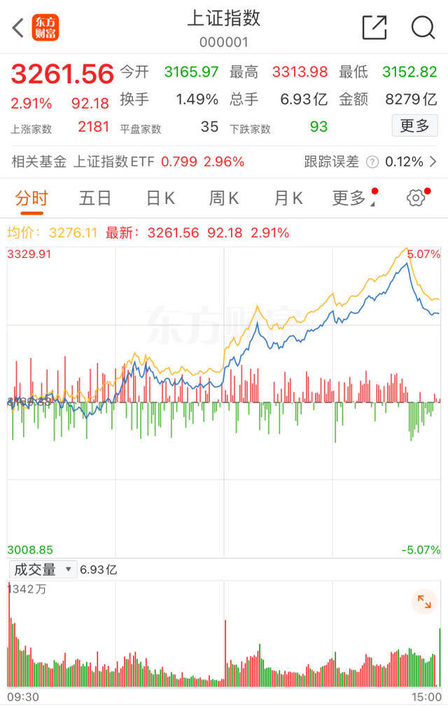 18日,A股三大指数集体大涨,截至收盘,沪指涨2.91%,深证成指涨4.71%,创业板指涨7.95%。沪深两市成交额突破两万亿元,较17日大幅放量近6000亿元,上涨股票数量超过5000只。