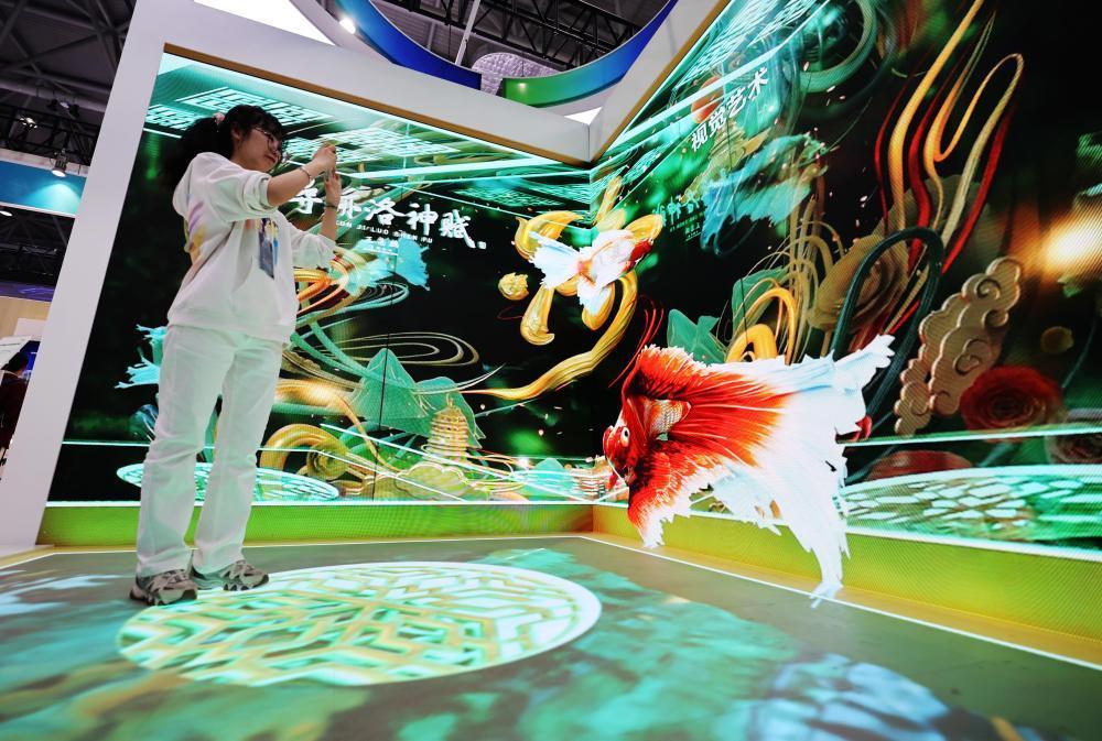 2024年4月1日,在安徽合肥举办的2024国际显示技术大会上,一名观众体验京东方展出的裸眼3D快速拆装折角屏。