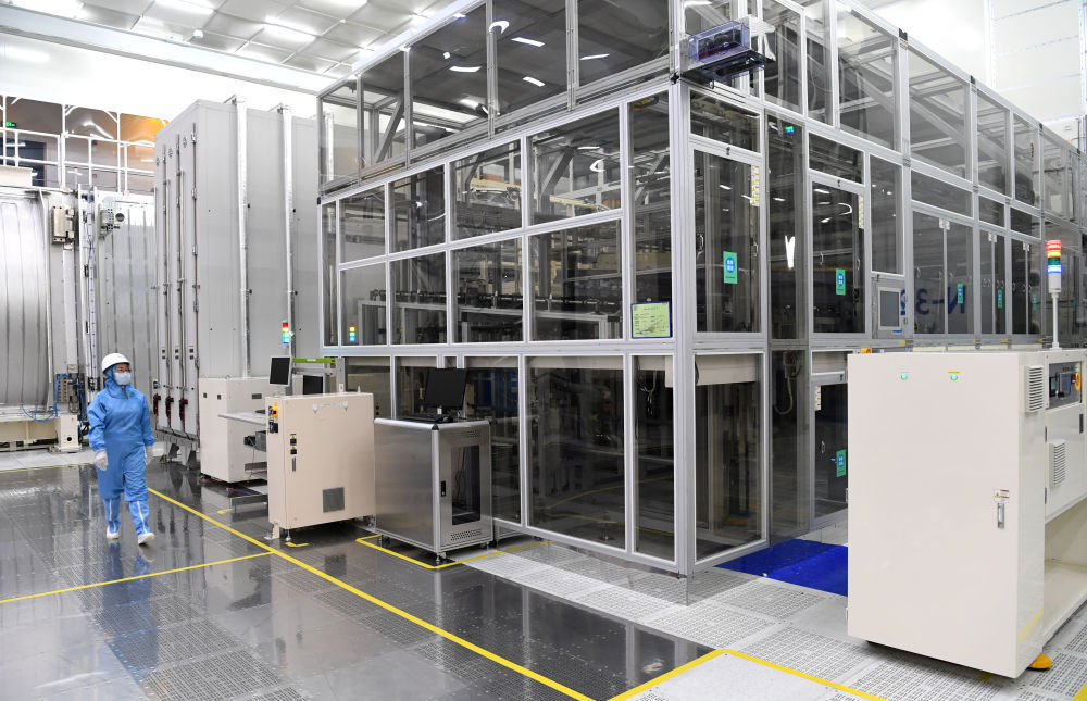 2022年7月28日,安徽合肥京东方显示技术有限公司的工作人员在10.5代生产线上作业。