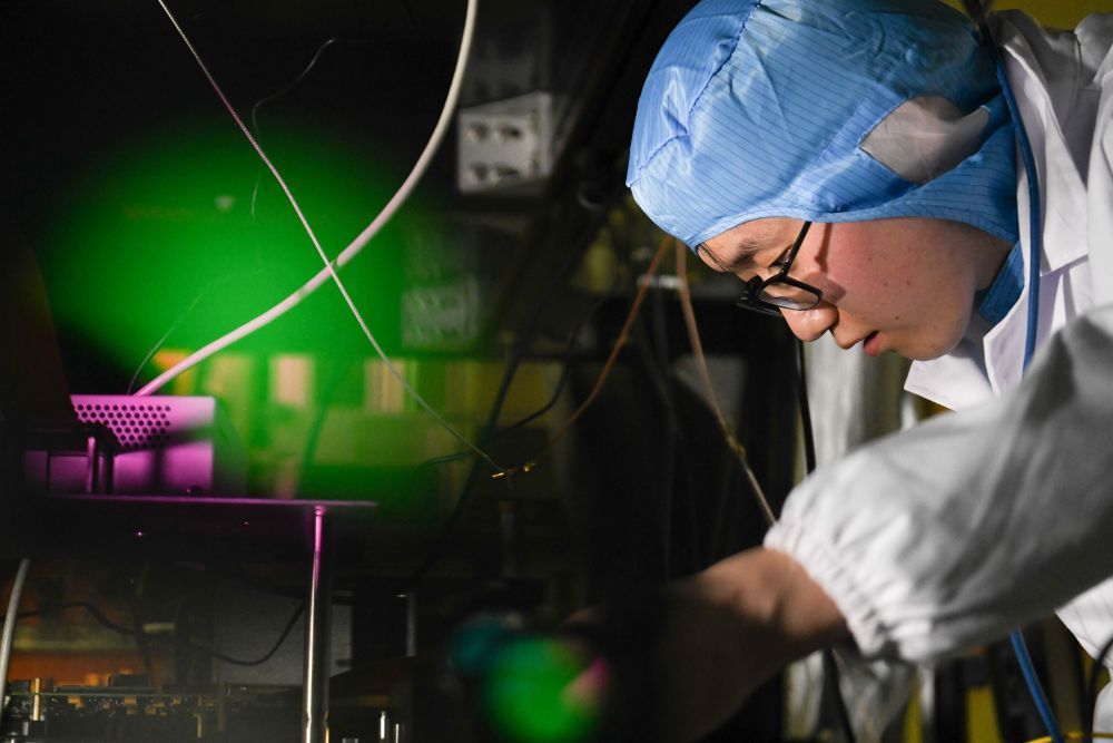 2022年1月31日,中国科学技术大学学生在中国科学院量子信息重点实验室做实验。