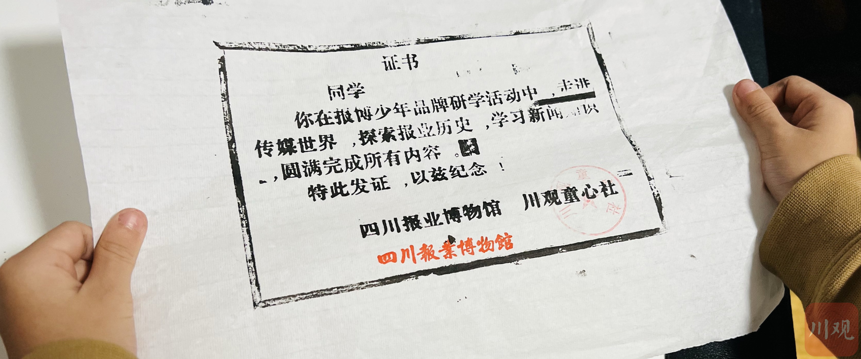 据悉,四川报业博物馆由一座老建筑“焕新”而来,总建筑面积1896.54平方米,分设四川报业发展主题展、四川日报报业集团主题展两大展厅和临展区,共有四川报业发展的相关文献资料、影像资料、采编用具、印刷设施设备等400多件展品。除了参观,传媒研学营还精心安排了传统文化体验活动,润纸、上墨、转印,孩子们在老师的带领下,观摩学习了独特的文化遗产——拓印和活字印刷技术,并现场活学活用亲手为自己制作了活动证书和四川日报创刊号。“哇,居然是自己制作证书,太棒了!”拿着刚刚亲手为自己制作的活动证书,天涯石小学二年级五班的黄理萌小朋友开心地与其他小伙伴们分享起了劳动成果。小营员们纷纷表示,一起动手,一起学习,不仅体验了传统文化魅力,更是收获了难忘的经历和友谊。