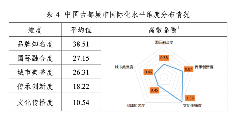 (离散系数是测度数据离散程度的相对统计量,主要用于多个总体均值不等的离散程度比较。数值越大,表明该总体内部数据分布较为分散;数值越小,表明该总体内部数据分布较为集中。本报告引用这一系数旨在反映古都城市在五个评价维度方面得分分布的差异化程度。)