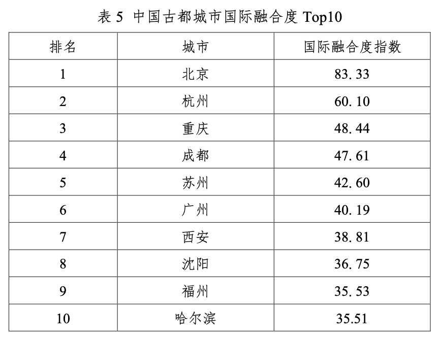 “中国古都城市国际融合度”榜单从国际友好度和国际认可度两个方面,反映了我国古都城市服务于对外文化交流的基础设施情况、积极性、开放程度以及国际社会的认可情况,体现了我国古都城市融入世界舞台、发挥古都历史文化价值的能力与水平。从榜单表现来看,作为我国首都同时也是金、元、明、清古都的北京,在国际融合度方面具有其他古都城市无法比拟的优势,其指数遥遥领先于其他上榜城市,特别是国际友好城市基础设施数量、对外联通便利程度等方面表现尤为突出。杭州位居榜单第二位。不可否认,2016年举办G20峰会以及获得2022年亚运会举办权对于提高杭州的国际化水平有重要贡献,而杭州西湖文化景观、良渚古城遗址相继申遗成功,为杭州获得国际社会认可发挥了不可替代的作用。其他上榜城市指数数值均在30-60之间,且相邻位次间差值较小,国际融合度竞争优势不突出,整体仍有较大发展空间。